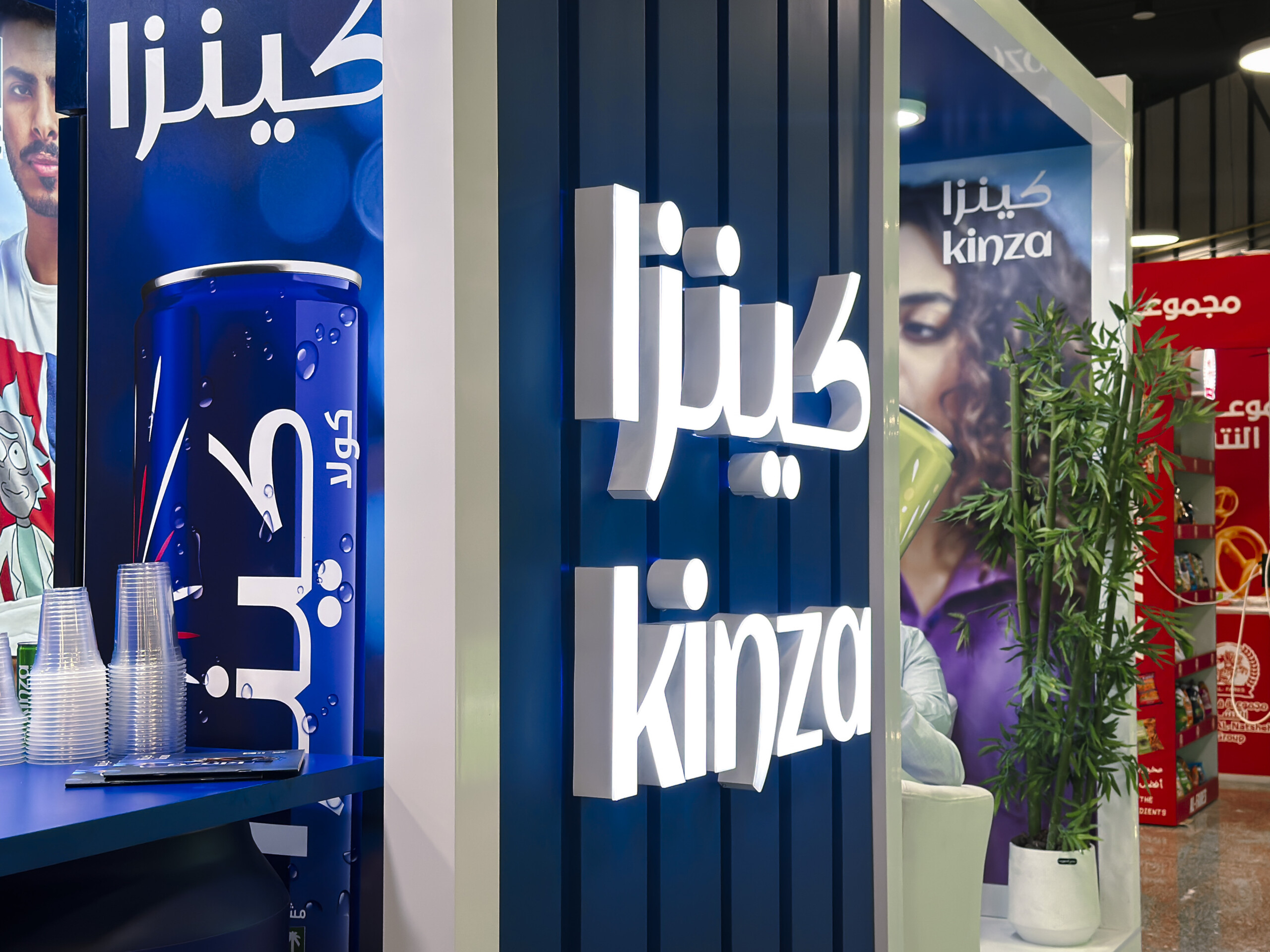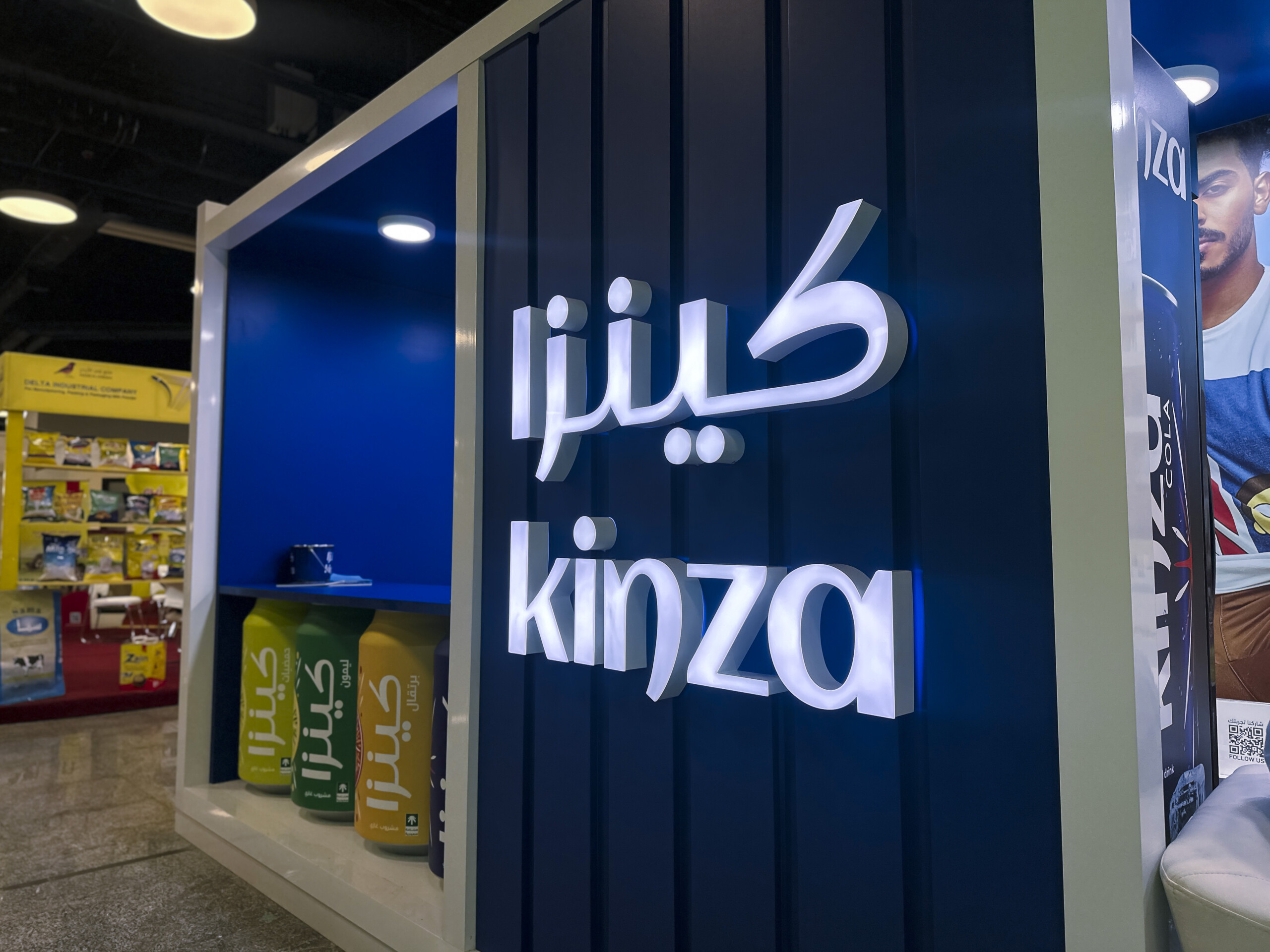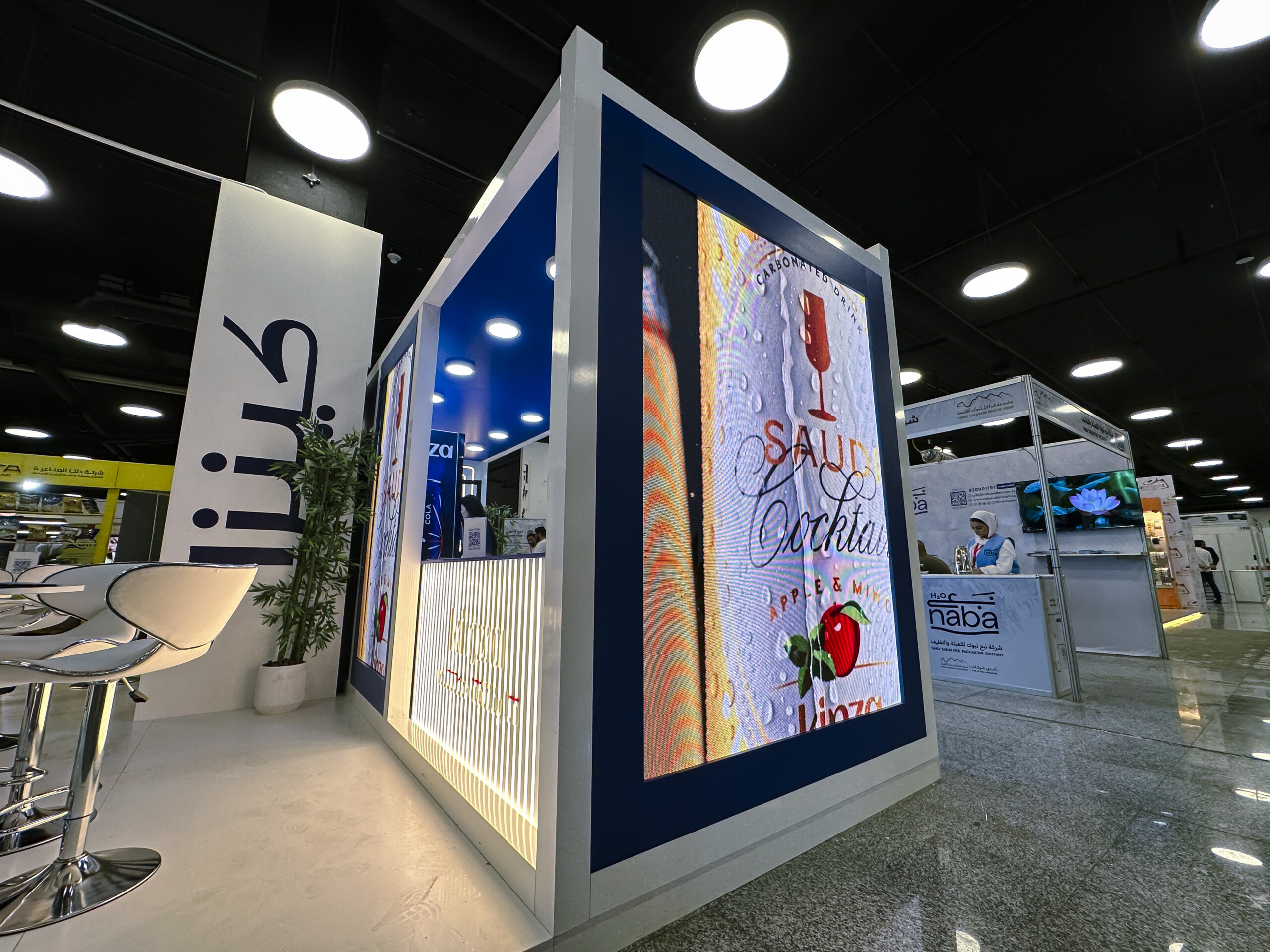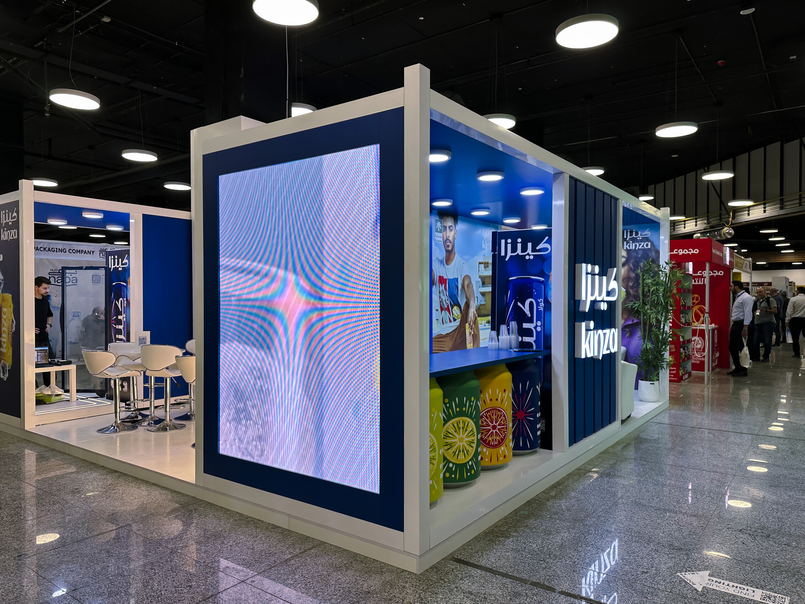 We executed the Kinza exhibition booth with an elegant and calm design that perfectly reflects the brand’s identity. The booth featured creative 3D models of their signature drinks and integrated screens to showcase the products in a modern and engaging way. The overall design highlighted the brand with a unique blend of innovation and simplicity, making the booth a standout attraction during the event.